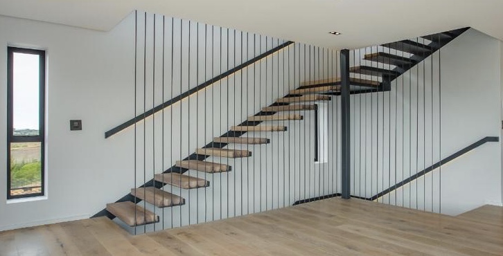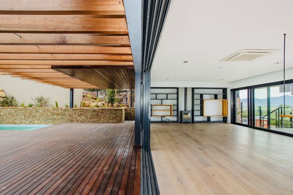 The home is terraced into the slope of the mountain behind with sheltered spaces on both sides of the main living areas. Close mountainside views over the stone wrapped training pool and its secret garden are balanced by wide openings onto floating timber decked terraces with vast distant views across the Berg River Valley.